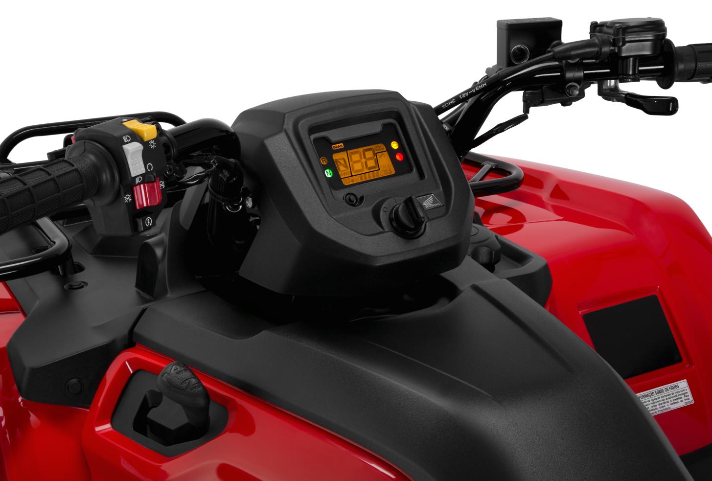 Painel Digital – Moderno painel digital com um visor compacto e completo, velocímetro, hodômetro total e parcial, horímetro, relógio, marcador de temperatura do líquido de arrefecimento, marcador de combustível, indicadores de marchas, tração 4×4 , ré e falha na bateria, além de uma função inovadora que indica a necessidade de manutenção.